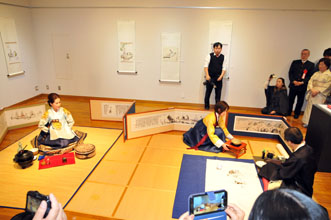 初日のオープニングセレモニーでは、韓国茶道東京茶礼房の李瑛子さんが韓国抹茶を披露。参加者は、初めて見る韓国抹茶のお点前を食い入るように見つめていた。会場に展示された金昌培さんの水墨画約50点は、韓国人と茶の関係を表す素朴だが、温かみを感じさせる。