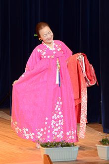 在日同胞の趙良葉さん(76)がピンク色の鮮やかなチマ・チョゴリと淡いオレンジ色のトゥルマギ姿で、愼玉熹さん(65)がカッ(笠)をかぶった両班の正式な衣装で登場すると、舞台がぱっと華やいだ。韓国民謡が流れる中、愼さんは扇子を操りながら、韓国舞踊も披露した。2人に観客から大きな拍手が送られると、笑顔でこたえた。