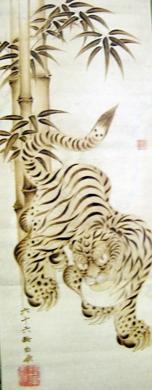 恋川白峨の焼絵「竹虎図」は、著者によると朴昌珪の孫朴秉洙が、日本人三山に烙画を伝授し、その長子が白峨との説もあるようだ。虎の描き方は朝鮮民画に類似しており朝鮮通信使など両国の文化交流の中での調査研究が待たれる。