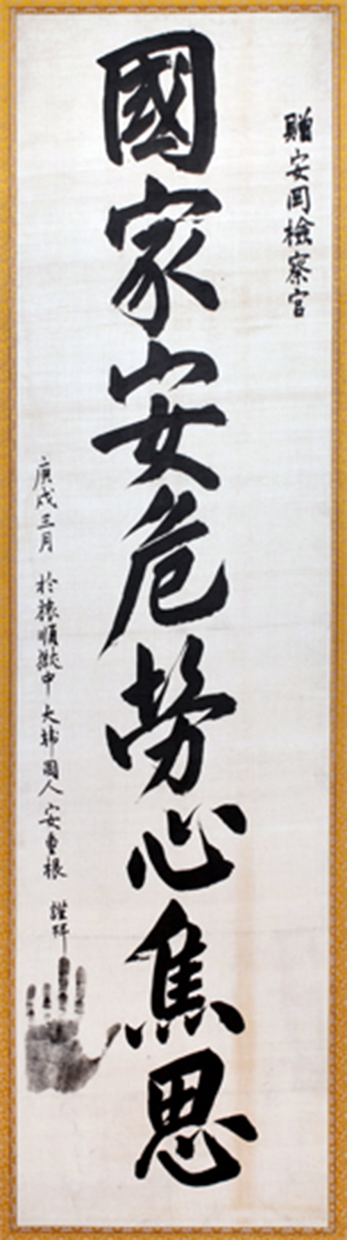 「国家安危労心焦思(国の安危を心配して気をもむ)」、「為国献身軍人本分(国のため献身するのが軍人の本分)」など韓国の宝物に指定されている安重根の親筆を一度に見られる。