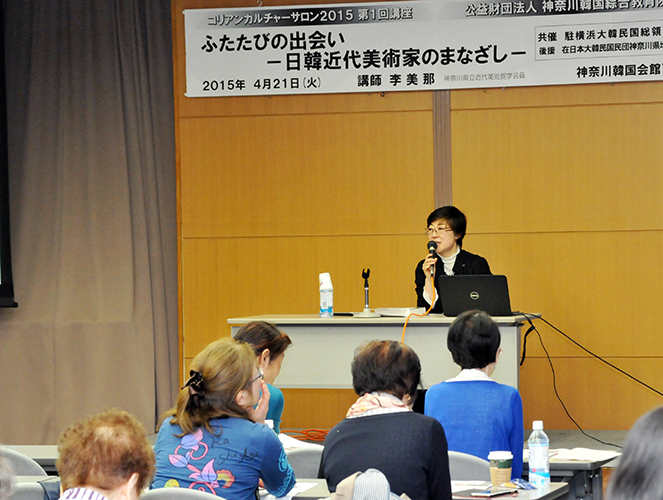 講師の李美那さん(神奈川県立近代美術館葉山・主任学芸員)が、5月8日まで葉山館で開催されている「ふたたびの出会い日韓近代美術のまなざし‐『朝鮮』で描く」を紹介しながら、韓国と日本の美術家たちの物語を読み解いた。