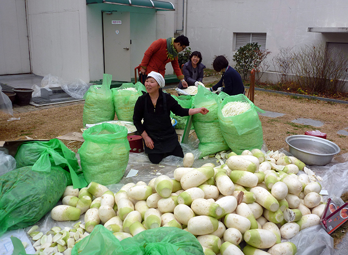 韓国国立民俗博物館から借用する「食の道具」100点余り、「キムチの解説動画」「大村しげコレクション台所資料」などの展示、「キムチ作り」(写真)、「おせち」「餅つき」などをバーチャル体験できる展示ほか。