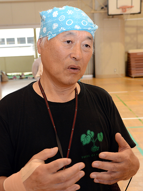 毎月1回、金さんが韓国から教えに来る4回目の練習が6月13日、平間小学校体育館(中原区)で行われた。金さんのいない間は児童の母親で少年団のOBで作る「和太鼓祭音」所属の堀内瞬さんが指導する。