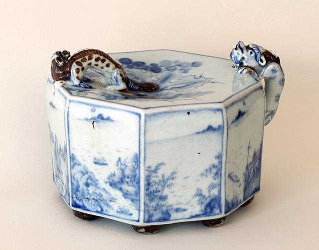 作品は、全体を八角に面取りし、その各面に中国の山水画の有名な画題「瀟湘八景図」を描いた青花鉄砂葡萄山水文八角形水滴「癸卯六月日分院」銘(写真)ほか。問い合わせは同館(06・6223・0055)。