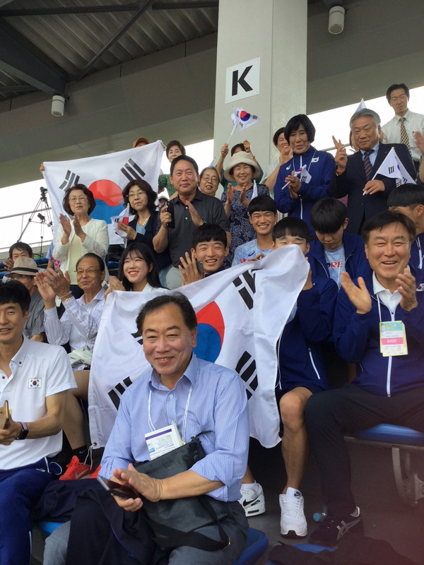 【岐阜】第18回アジアジュニア陸上競技選手権大会開催日の7日、岐阜メモリアルセンター長良川競技場で100人規模の民団関係者が韓国選手団14人に声援を送った。