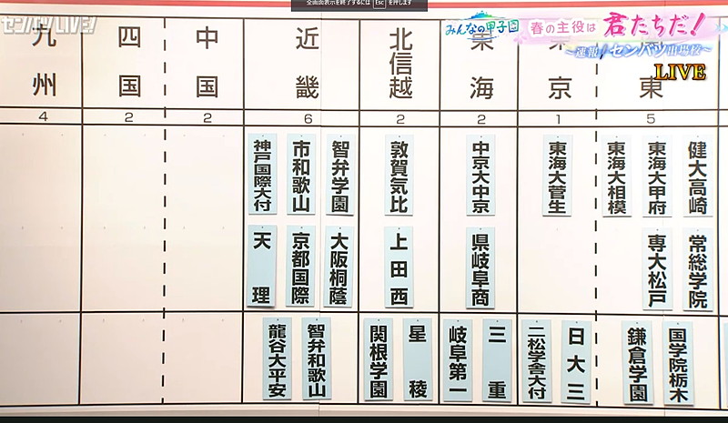 このうち近畿は6校となっていて、昨年秋の近畿大会で優勝した奈良の智弁学園、準優勝の大阪桐蔭高校、4強に入った京都国際高校と市立和歌山高校が有力とされていた。