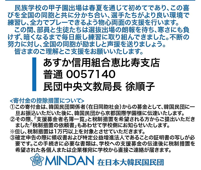 あすか信用組合恵比寿支店。普通0057140。民団中央文教局長 徐順子。