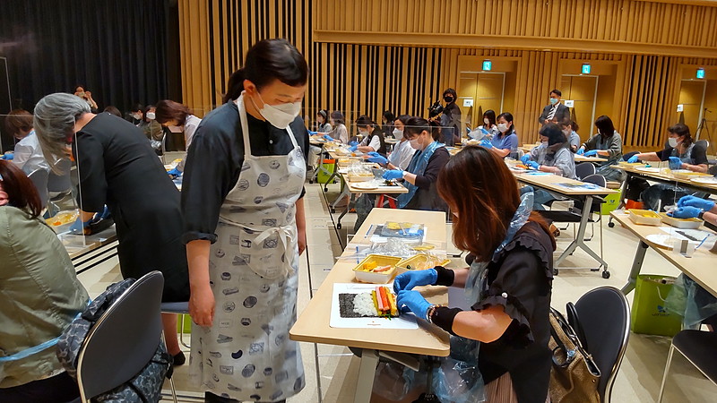 韓国ドラマ「冬のソナタ」時代から韓国が大好きだという40代の片野明子さんは、家でもチヂミやサムギョップサルなどを楽しむという。今回は、「見よう見まねで作るより、レクチャーを受けると新しい発見があるのではないか」と参加した。形よく仕上がったキムパを手に笑顔を見せた。