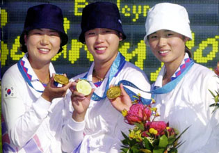 まずダントツの金メダル候補は、女子アーチェリーの団体戦。88年のソウル大会でこの種目が採用されて以来4連覇が続く。今回も、オリンピックで勝つより難しいと言われる国内予選を勝ち抜いた尹美進、朴成賢、李成震の3人(写真・左)に死角はない。