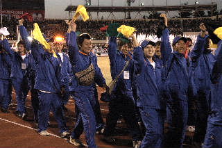 カラフルなレーザー光線で彩色された開会式で在日同胞選手団111人(朴安淳団長)も旗手の李興雨選手(テニス男子)を先頭に堂々と入場行進。五輪旗と同じ5色のバンダナを手にスタンドの拍手に大きくふって在日同胞をアピールした。