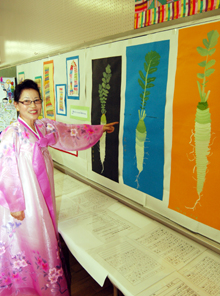 [ 自作の「大根の絵」の前に立つ生徒の金花子さん ]