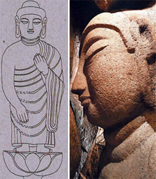 仏像は高さ5・6㍍の如来像で、70㌧に達する花崗岩に浮き彫りで施されている。楕円形の顔と高い鼻、伏し目がちの長くて鋭い目つきと厚めの唇、そして肩にとどくほどの大きな耳が特徴で、類似の事例を見つけるのは非常に難しいという。