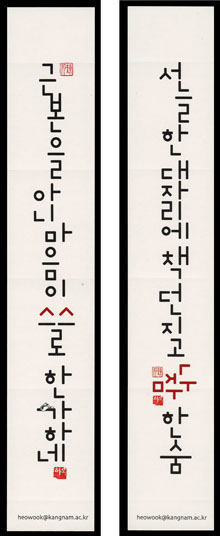 柱聯は縁起のいい句や教訓となる句を木版に刻んだり、紙に書いて柱に貼りつけるもので、韓国では昔、この柱聯を外から見える場所に貼り、その家に住む人たちの品格や家風を見せたとされる。作品は本来の漢字をハングルを用いてデザイン化したもの。裏面はシールになっている。