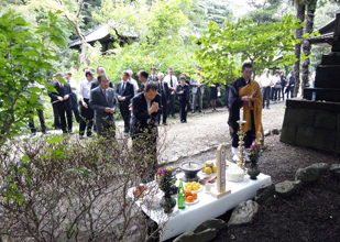民団神奈川本部(李富鉄団長)は1日、「韓国人慰霊碑」の建つ横浜市南区の宝生寺で第88回関東大震災犠牲同胞慰霊祭を執り行った。住職の読経が流れるなか、震災発生の11時58分から約15秒おきに9回、鎮魂の鐘が打ち鳴らされた。この後、追悼碑の前で民団関係者50人が焼香した。