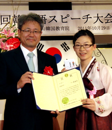 金さんがテーマとしたのは、「在日韓国人だと自覚した瞬間」。バレンタインデーに好意を寄せていた相手に手作りチョコレートを渡したところ、「ふたを開けた瞬間にキムチのにおいがした」と言われたことなど、過去のほろ苦い体験を明るい表情でスピーチした。金さんは韓国語を学び始めてから4年。同スピーチ大会への出場はこれが2回目。「とってもうれしくて言葉が出ません」と喜びをかみしめていた。