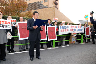 「アピール文」を東京本部の李寿源監察委員長が朗読、南照男副団長が門を閉ざした本部内に差し入れたが、押し出された。全員で「北韓と総連は延坪島武力挑発を謝罪せよ」「北韓は武力挑発と核兵器開発を即刻中止せよ」「総連と傘下同胞は軍事挑発を繰り返す北韓独裁政権の3代世襲に反対せよ」「飢餓に苦しむ北韓同胞の救済に立ち上がれ」とシュプレヒコールし、在日同胞の強い思いを伝えた。