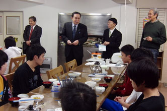 鄭団長は、食堂で夕食中の児童たちを「元気な姿を見て、とてもうれしい。社会に出ても元気に活躍してほしい」と激励した。児童たちは「はい」と笑顔いっぱいに大きな声で答えていた。
