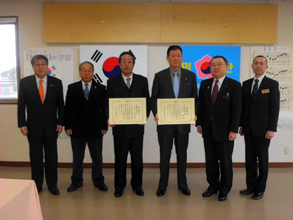 【岩手】民団中央本部と韓商連による昨年の東日本大震災被災者支援事業に対し、岩手県から18日、達増拓也知事名の感謝状が贈られた。鄭進中央団長に宛てた感謝状は金盛義岩手団長、同じく朴忠弘韓商連会長名義のものは李太炯岩手会長が代理で受け取った。