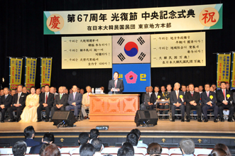 中央式典は金龍濤東京本部団長の開式辞で始まり、申 秀駐日大使が、国民と北韓同胞および在外同胞に向けた李明博大統領の「第67周年光復節慶祝辞」を代読した。