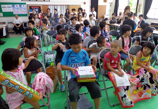 お祝いにと、民団大阪本部(鄭鉉権団長)から「ハングルカルタ」と民族学級・クラブ向け共通教材『セクトンナルゲ」、大阪韓国教育院(宋鍾錫院長)からはチャンゴ、プク、ケンガリなどが贈られた。民団大阪の鄭炳采事務局長は、「民団主催の来年のカルタ大会には『八尾オリニバン』からチームで参加してください」と呼びかけた。