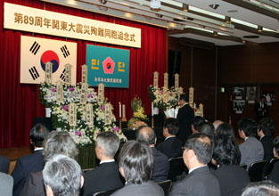 東京・港区南麻布の韓国中央会館で営まれた第89周年関東大震災殉難同胞追念式には、民団中央本部の呉公太団長、韓在銀監察委員長ら幹部、婦人会中央本部の余玉善会長、民団東京本部の幹部、各支部支団長、婦人会、青年会の幹部をはじめ約200人が参列した。