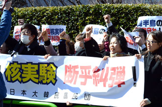 民団中央本部の呉公太団長は12日、北韓が昨年12月の長距離弾道ミサイルの発射に続き、同日に3回目の地下核実験を国連安全保障理事会の決議を無視して強行したことに対して、在日同胞の激しい怒りを込め「抗議声明」を発表した。翌13日には全国各地の民団地方本部を中心に、北韓の代弁機関である総連の中央・地方本部への一斉抗議・糾弾活動を展開した。呉中央団長の抗議声明は次のとおり。