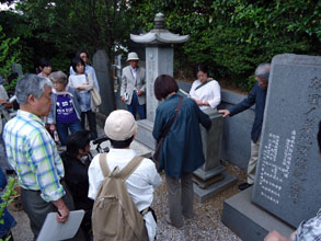 遺骨は解放後、同胞の手で堀り起こされ、港北区の菊名山蓮勝寺と東林寺に改葬された。一行はフイールドワークの最後に蓮勝寺を訪れ、李誠七氏らが発起人となって建立した朝鮮人納骨塔転徒改葬記念碑と民団神奈川本部の韓国人墓地改修記念碑などの前に立ち、持参した花を手向けた。