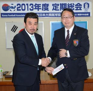 この日、在日本大韓体育会の趙靖芳専務理事や同関東本部の張智成会長らも参席、体育会中央からサッカー協会に激励金が伝達された。