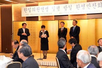 民団中央本部は11月30日、日韓議連との合同総会に参加した黄祐呂会長(セヌリ党代表)、金星坤副会長(民主党・世界韓人民主会議首席副議長)ら韓日議連一行を歓迎する晩餐会を都内のホテルで開催し、韓日関係の改善に向けて力を合わせ、ねばり強く努力することを確認しあった。