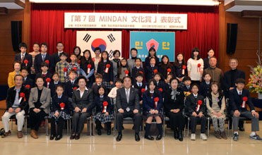 民団中央本部主催の「第7回MINDAN文化賞」に入賞した56人の表彰式が14日、東京・港区南麻布の韓国中央会館で行われた。在日の文化事業振興の一環として、文化・創作活動を奨励すると同時に在日の可能性と方向性を見つめることを目的に2007年に設けられたMINDAN文化賞は、論文・論壇、詩歌、写真、孝道部門に今年から絵画とウリマル(ハングル)普及部門を新設して6部門となった。