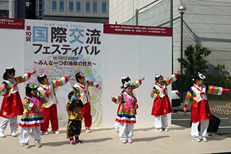 世界の民族文化を紹介するコーナーでは、静岡チャンゴ教室と同本部韓国文化スクールに通う子どもたちが仮面をかぶって屋外の特設ステージに立ち、サントッケビ(山鬼)を元気に歌い、踊った。