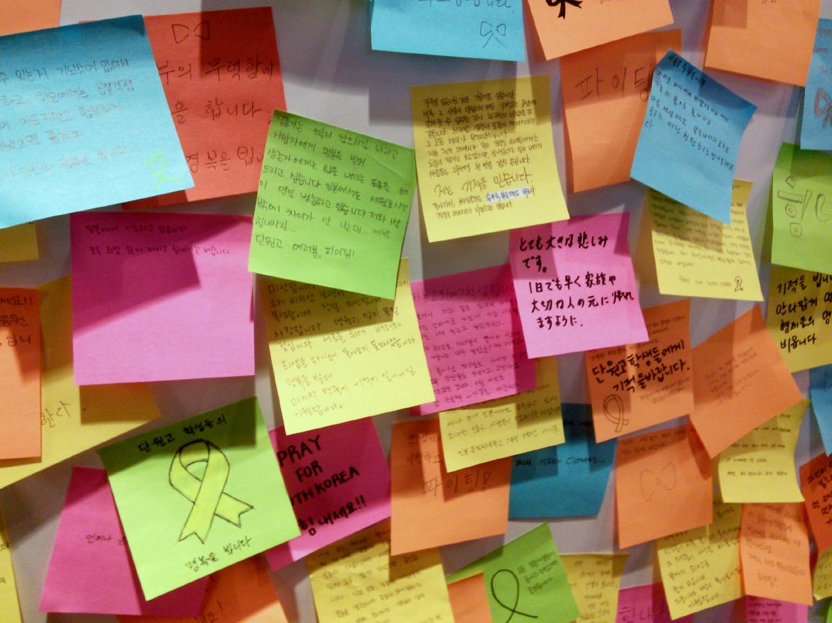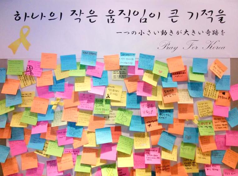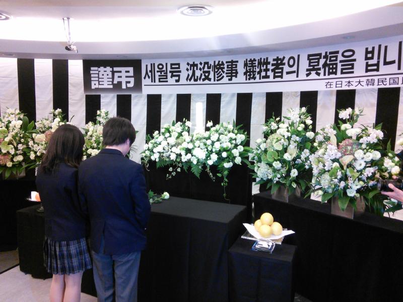 セウォル号沈没惨事の犠牲者の冥福と不明者の一日も早い発見と生存の奇跡を願い、25日午後、東京港区南麻布の韓国中央会館(民団中央本部会館)に献花台とメッセージボードが設置された。