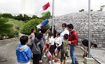 県平和祈念財団が呼びかけた。今年で10回目。韓国人慰霊碑前でも民団沖縄本部「土曜学校」の子どもたち18人が、こいのぼりを掲揚して平和を祈った。
