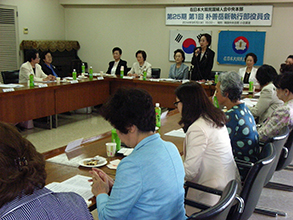 婦人会中央本部(朴善岳会長)は7日、韓国中央会館で新執行部を構成してから初となる役員会を開催した。会議には執行部役員19人全員と顧問団、監査団が出席した。執行部には40代も加わり、清新な印象を与えた。それぞれ自己紹介でこれからの婦人会活動への意欲を新たにしていた。