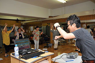 豊作を祈る民謡「オンヘヤ」は合いの手以外の歌詞を受講生それぞれが作詞して楽しんでいる。DVD画面に映し出された自ら創作した歌詞を見ながら体を動かし、ノリノリで楽しんでいる。