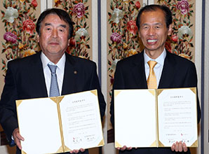 民団中央本部の呉公太団長と崔文洵江原道知事は10月23日、江原道江陵市内のホテルで「共生協力協約書(MOU)」について締結した。