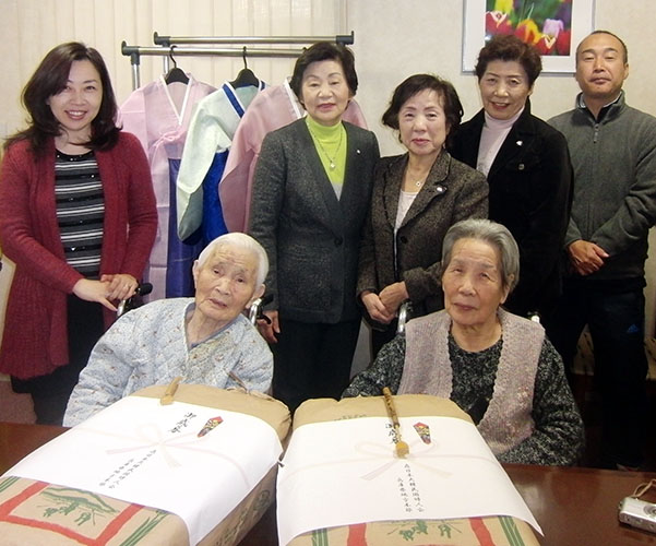 同本部から李会長と李貴連監査、崔和代総務部長が孫の手30本を持参して訪問。李監査個人からは真新しいチマ・チョゴリ7着もプレゼントされた。