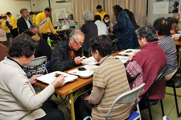 仮設大森第3団地では167戸273人がいまも不自由な避難生活を余儀なくされている。炊き出しは拠点センターで行った。呉会長をはじめとするメンバー7人が参鶏湯を温め、持参したプレートに白菜と大根のキムチ、韓国海苔とともに盛りつけた。試食した住民からは「スープ、ものすごく美味しい」という声が聞かれた。