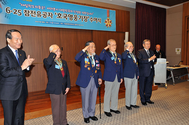 1950年の韓国戦争勃発時に自らの命を捧げて日本から参戦した在日学徒義勇軍の生存者10人に対し、大韓民国国家報勲処(朴勝椿処長)は、6・25参戦有功者「護国英雄記章」を贈った。海外での授与はこれが初。式典は7日、駐日韓国大使館で行われた。