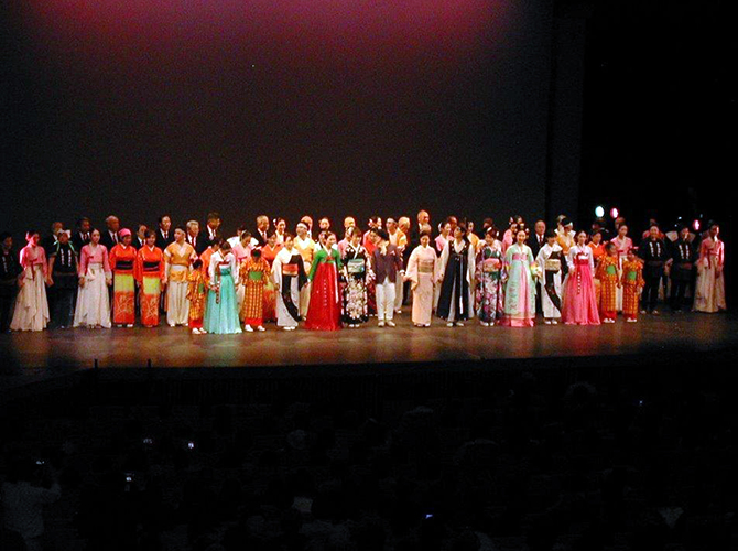 式典に続き国交正常化50周年を記念した「日韓伝統芸能富山公演」があり、市民約1100人が観覧した。韓国側から済州道立舞踊団が出演、日本側も伝統の詩吟や民謡、「おわら踊り」などを披露した。
