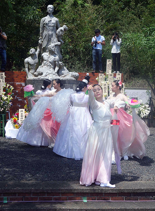 また、韓国茶道協会の尹道心京都支部長による献茶があり、韓国伝統芸術院の金一志さんが慰霊の舞を捧げた。最後に参者全員が海に向かって花を投げ入れ、黙祷した。
