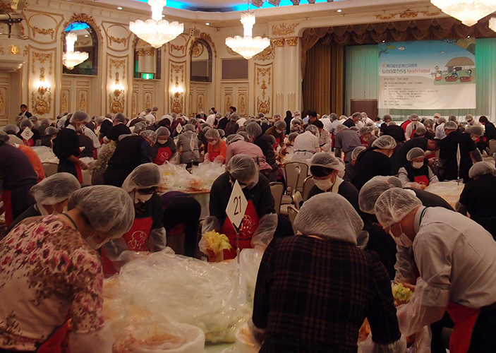 【宮城】「仙台白菜で作るキムチフェスティバル」(仙台総領事館、宮城県など主催、仙台市共催)が18日、仙台市内のホテルで行われ、市民約220人が参加した。東日本大震災の被災地支援と韓日交流促進を目的としており、今年で3回目。