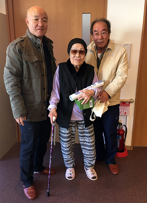 金夏日さん(88)は病気が進行し、23歳で両眼を失明。指の触感も麻痺したため、点字を舌で読む「舌読」を学び、短歌を作ってきた。居室で民団関係者4人を迎えた金さんは、「遠いところからよく訪ねてくれたね。民団には大きな恩を受けた」と感謝の言葉を口にした。