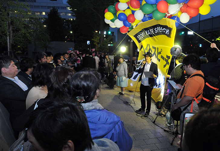 現場には3メートル四方の横断幕「ヘイトスピーチ、許さない」が風船で吊り上げられた。その下でゲストスピーカーが次々とマイクを握った。