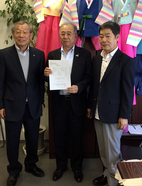 [ 石井雅彦教育長(中)と民団関係者 ]