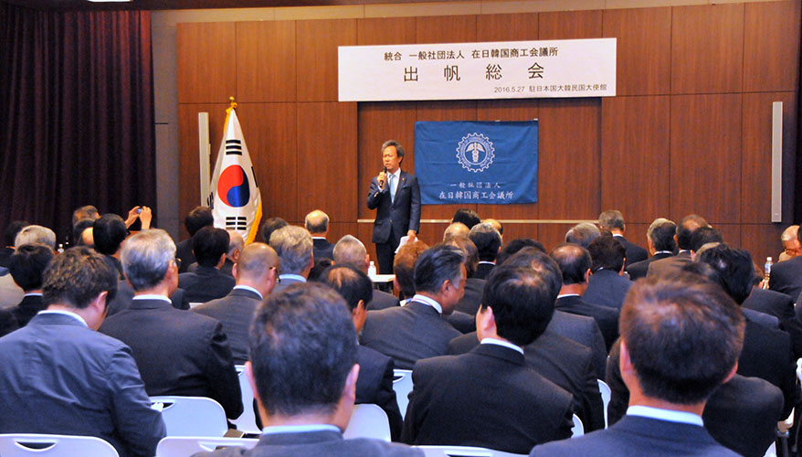 紛糾状態にあった在日韓国商工会議所と一般社団法人在日韓国商工会議所が5月27日、「統合一般社団法人在日韓国商工会議所出帆総会」を駐日韓国大使館で開いた。