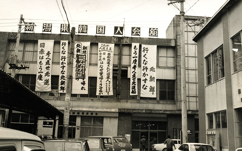 [ 新潟駅前の民団新潟本部に掲げられた「北送反対」のたれ幕 ]