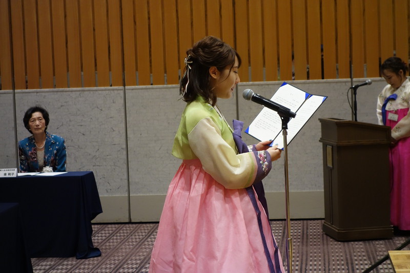 新成人を代表して文千受さん(兵庫県立大学2回生)が「韓国と日本の友好促進の懸け橋として活躍できる成人になり、先輩たちと共に大きな夢と希望をもってまい進していきます」と謝辞を述べた。