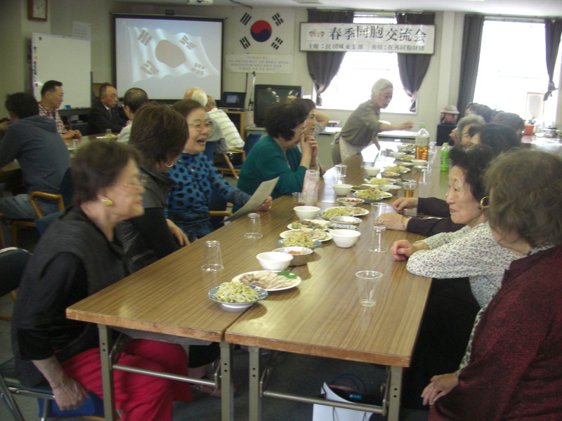 民団城東支部(金源奉支団長)の「春季同胞交流会」には28人が参加。婦人会の用意したキムチと豚肉、ナムルを味わった。食事後のカラオケでは親子3代そろってマイクを握る光景も見られた。