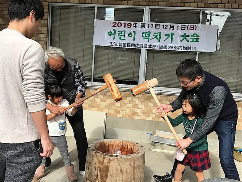 【佐賀】民団佐賀本部のオリニ餅つき大会は12月1日、佐賀市の民団敷地内であった。オリニは杵を握りながら夏のキャンプで出会った友だちと久しぶりの再会を喜んでいた。